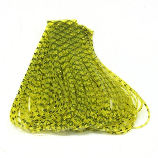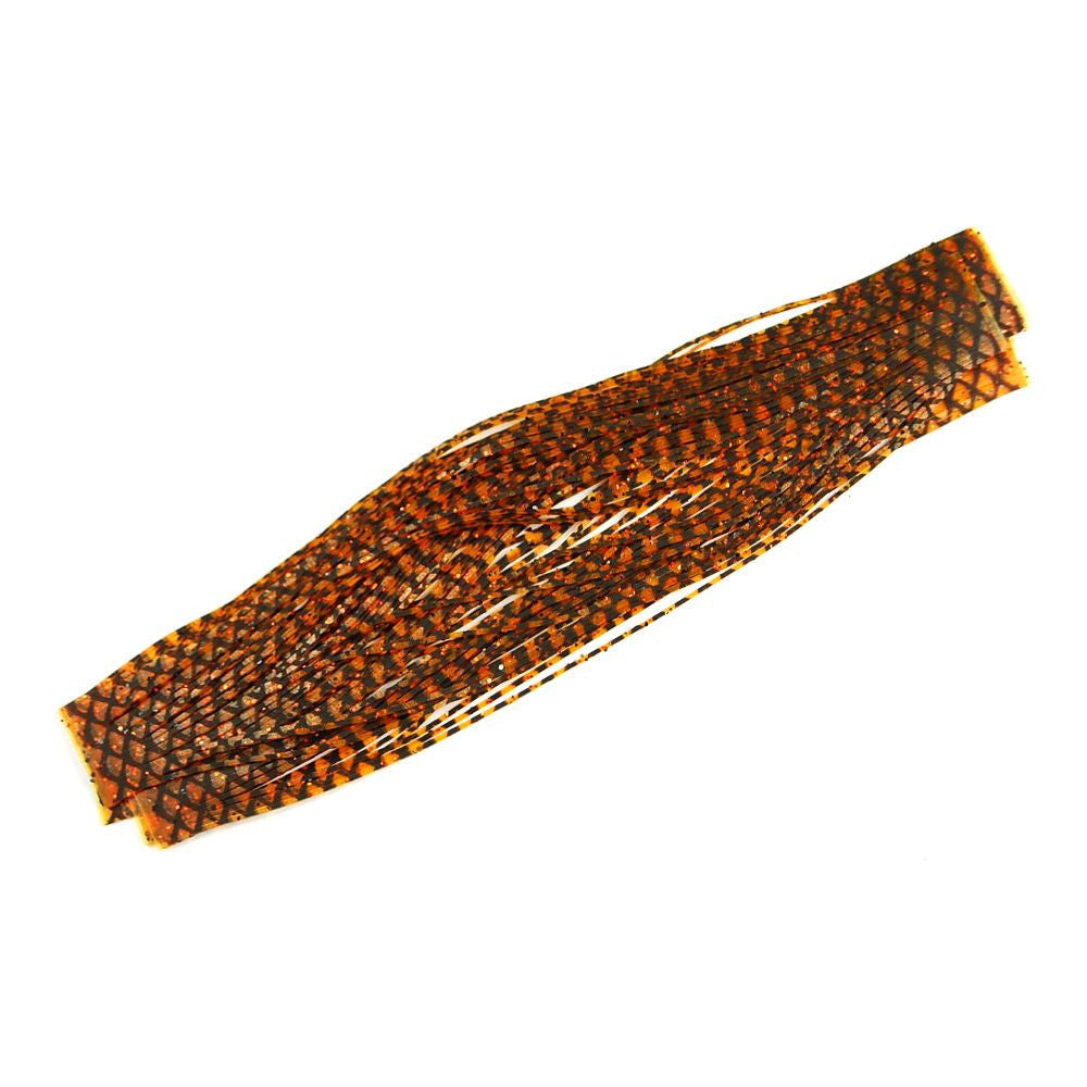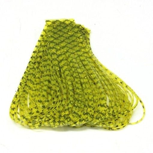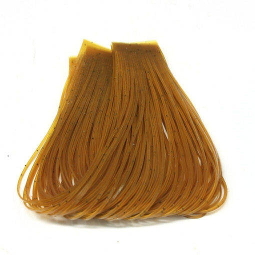 5 1/2" long rubber legs with flakes. 5 bands of 23 legs that are popular for fresh and saltwater patterns.