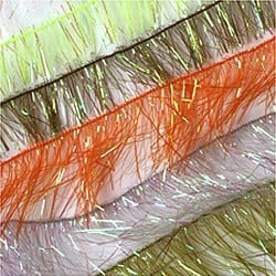 A single-sided chenille with fine hair-like fibers mixed with pearlescent thin mylar that can be used to wrap collars or palmered for streamer bodies. Ideal for articulated streamer patterns, and also works well as a replacement for streamer sized dubbing brushes.